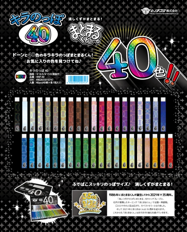 ホーム > 新製品情報・特集 > ヒノデワシ、消しゴム【まとまるくん35周年記念商品第2弾】ドーンと40色「キラのっぽ40」を発売