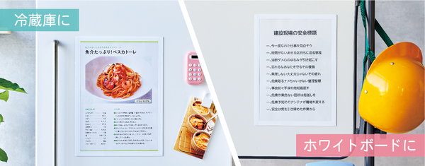 ホワイトボードや冷蔵庫等にマグネットを用いて書類を貼り付ける際、「紙端が垂れて書類が見えづらい」、「マグネットで文字か隠れて掲示の邪魔になる」、「書類が汚れやすい」といった問題があります。そこで、高透明PVCシートの裏面3辺にマグネットが付いた、書類を簡単に掲示できるマグネットフレームを発売し、これらの問題を解決します。