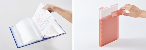 それらの不満点に着目し、とじ具がなくルーズリーフをポケットにはさむだけで簡単に分類、閲覧できる「ルーズリーフイン ホルダータイプ」と、硬くて丈夫な仕様で、収納したルーズリーフをしっかり保護する「ルーズリーフイン ケースタイプ」の2種類の収納用品を開発しました。