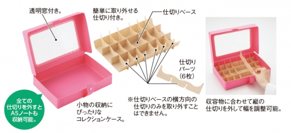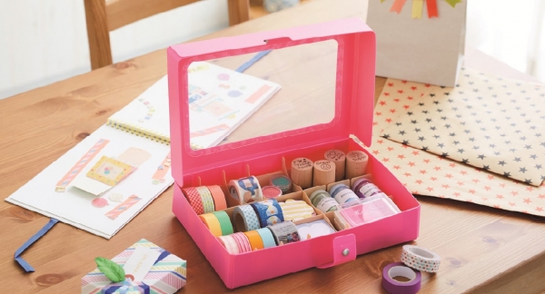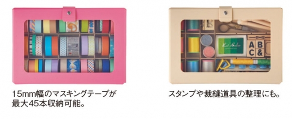 従来のハンドケースよりも小物の収納に特化し、その中でも特にマスキングテープが収納しやすい仕様で、中に入れたものが綺麗に見える仕切り付きのコレクションケースを発売致します。