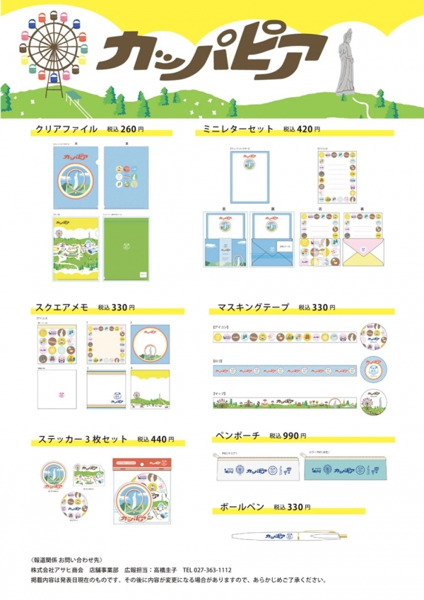 株式会社アサヒ商会(本社:群馬県高崎市問屋町2-8-2 社長:廣瀬一成)は、株式会社アサヒ商会の所在地である群馬県高崎市にかつて存在した遊園地「カッパピア」をイメージした雑貨ステーショナリーを自社が運営する大型文房具店ハイノート(群馬県内3店舗)、オンラインストアにて8月7日10:00より数量限定発売いたします。