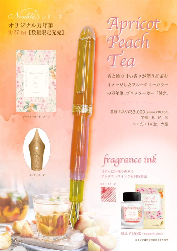 文具卸・店舗運営の株式会社エヌ・ビー・シー(本社東京都港区 / 代表取締役社長 丸山裕子、以下エヌ・ビー・シー)はこのたびオリジナルブランドNONBLEから数量限定のオリジナル万年筆&インク『アプリコットピーチティー』を8月27日(金)よりエヌ・ビー・シーが展開する全国14店舗で販売いたします。