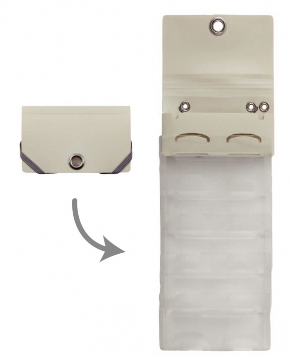 「スライドフォルダーポイット」は、カードや書類、ハガキを収納でき、吊るすことで一覧管理できる壁掛けフォルダーです。小さく畳んで収納できるので、持ち歩きも簡単です。 ラインアップは、カード6P・カード12P・ハガキ6P・長3封筒6Pの4種です。カラーはブラック・ホワイトの2色です。郵便物やポイントカード、書類の一覧管理ができ、ご家庭やオフィスなどで幅広く活用できます。