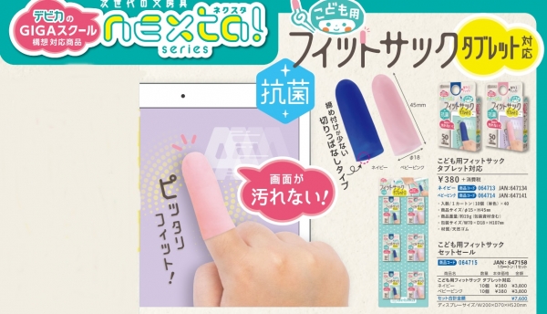 新製品の抗菌「こども用フィットサック」は、指に負担が少ない切りっぱなしタイプでピッタリフィット。直接触れずに操作ができるので画面が汚れません。