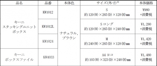 ラインアップは用途に合わせて選べる「キーニ スタッキングユニットボックス」と、「キーニ ボックスファイル」の2種類を用意しました。スタッキングユニットボックスは、積み重ねることができるので、ご家庭の収納スペースに合わせてすっきり収めることができます。ボックスファイルは、A4の書類やファイルの収納に最適なA4ヨコ型です。本体色は、定番のナチュラルとシックなブラウンの2色展開です。