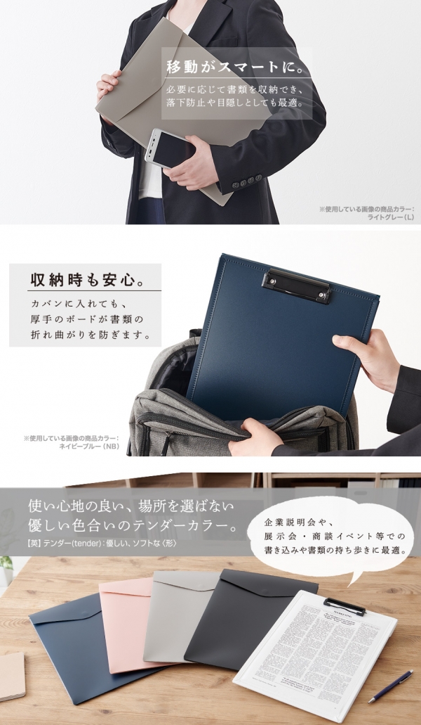●収納時も安心。カバンに入れても、厚手のボードが書類の折れ曲がりを防ぎます。