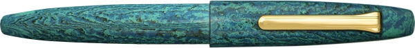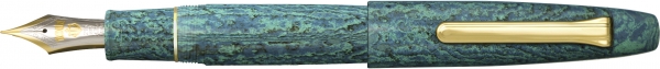 超大型の21 金長刀研ぎペン先を搭載し、重ねたエボナイト材にチラシ細工を施した重厚感のあるエボナイト万年筆「緑響」。
