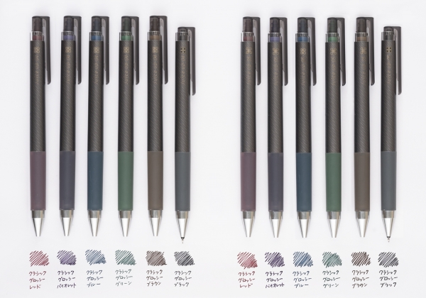 インキ色は、ブラック、レッド、ブルー、グリーン、バイオレット、ブラウン系の6色で、ボール径は0.4mm超極細タイプと0.5mmの極細タイプの2タイプです。ボディはダークブラウンを基調とし、ロゴはゴールドで仕上げ、大人らしさを演出しました。