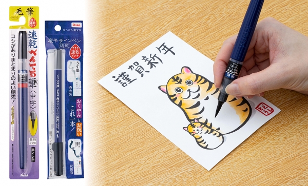 このような、「年賀状には心を込めて手書きをするために筆ペンを使いたい一方、不便に感じることが多い」という若者世代におすすめなのが、「速乾ぺんてる筆」です。