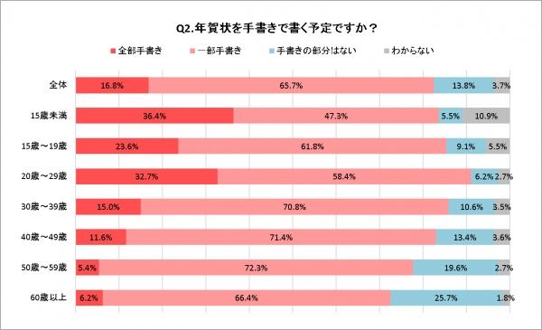 年賀状を「全部手書き」または「一部手書き」で書く予定と答えた人は全世代で82.5%に上りました。世代別に見ると20代が91.1%と最も高い結果となっています。