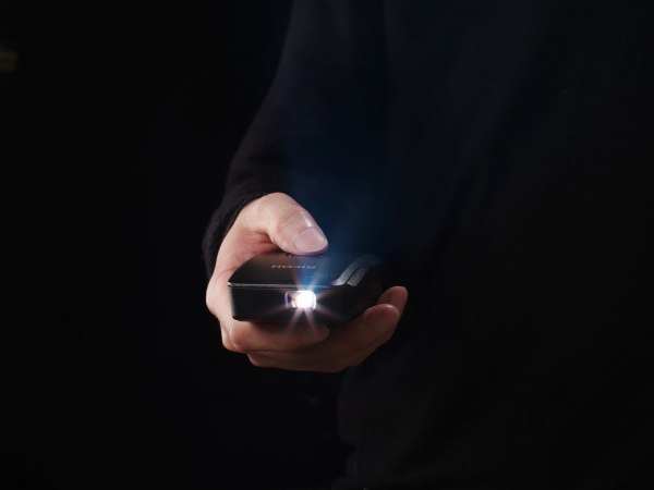 投影したい映像は、待機状態からボタンひとつですぐに投影可能です。また、手持ちで使用することを前提としているため、一般的な据え置き型のプロジェクターにある冷却ファンを搭載しないファンレス設計としており、ファンが動作することによる風や音が発生しません。また、バッテリー内蔵やWi-Fi接続対応により、各種ケーブルをつなぐ煩雑さがなく、場所を選ばずご利用いただけます。