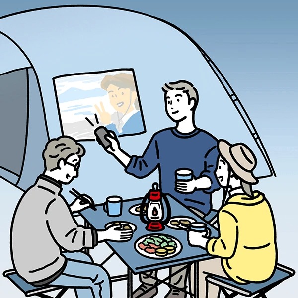スマートフォンの画面を机や壁・天井・床などに投影することで、複数人でスマートフォンを覗き込まずにウェブでの検索結果画面や撮影した写真の共有ができ、レストランやカフェなどオフィス外での打合せや簡易プレゼンテーション、展示会場・観光施設・美術館などでの案内情報の投影などのビジネス領域にとどまらず、家族や友人間での写真や映像データ、ビデオ通話の共有など、さまざまなシーンで活用いただけます。
