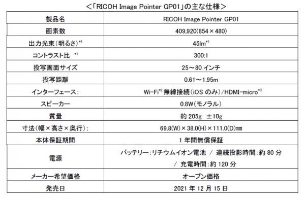 株式会社リコー(社長執行役員:山下 良則)は、スマートフォン等の画面を投影し、複数の人と写真や情報を手軽に共有することができるポケットサイズの小型ハンディプロジェクター「RICOH Image Pointer GP01」を、 12月15日からECストアで販売開始します。