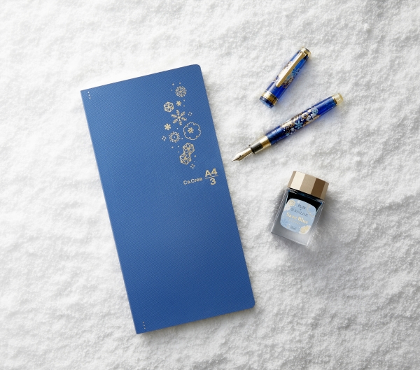 コラボレーション企画第5弾のテーマは“雪華”。雪華とは、「雪の結晶、又は雪が降る様子を花に例えた言葉」です。ノートには、キラキラとした雪の結晶をゴールドの箔押しで表現。万年筆は、冬の空を連想させる透明の濃いブルーのボディ全体に、雪をイメージした細かいシルバーラメと雪の結晶柄を施しています。14金のペン先・蓋栓にもワンポイントの雪の結晶柄を施しました。