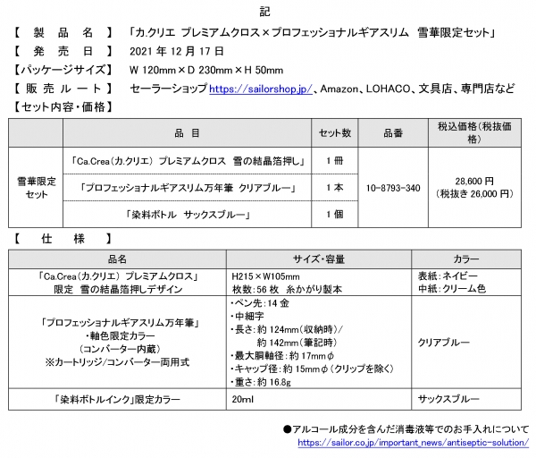 プラス株式会社(東京都港区 代表取締役社長 今泉忠久、以下プラス)と、セーラー万年筆株式会社(東京都港区 代表取締役社長 比佐泰、以下セーラー万年筆)は、“雪華(せっか)”をテーマにノート、万年筆、ボトルインクをセットにした「カ.クリエ プレミアムクロス×プロフェッショナルギアスリム 雪華限定セット」を2021年12月17日に数量限定発売します。