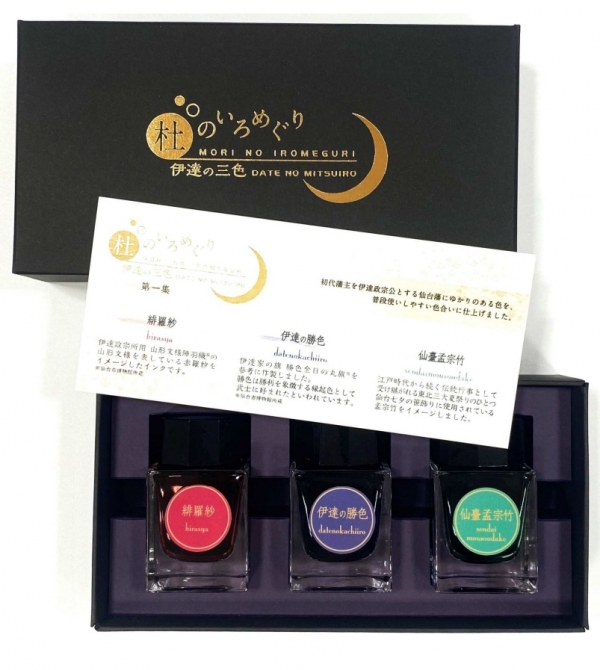 ホーム > 新製品情報・特集 > 文具の杜、オリジナル万年筆インク 「杜のいろめぐり 伊達の三色~第一集~」伊達政宗公ゆかりのある色を表現