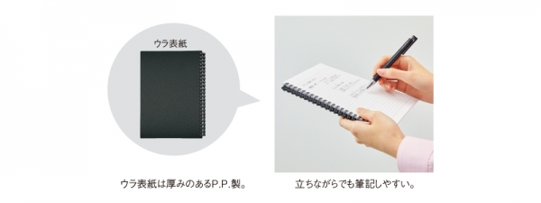 立ったまま筆記しやすいよう、うら表紙は丈夫な厚めのP.P.表紙(生地厚0.75mm)を採用。