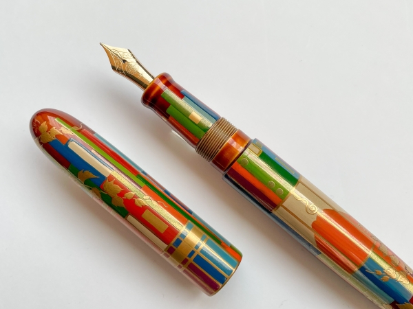本屋の象徴である「本棚」と“永遠”を花言葉に持つ「蔦の葉」をモチーフに制作。色とりどりの上質な漆を、もっとも美しくみせるために、中屋万年筆の職人のみなさんの技術を集結し、白檀塗りをベースに、金地色塗り込みや、付け描きなどの贅沢な技法で表現しました。