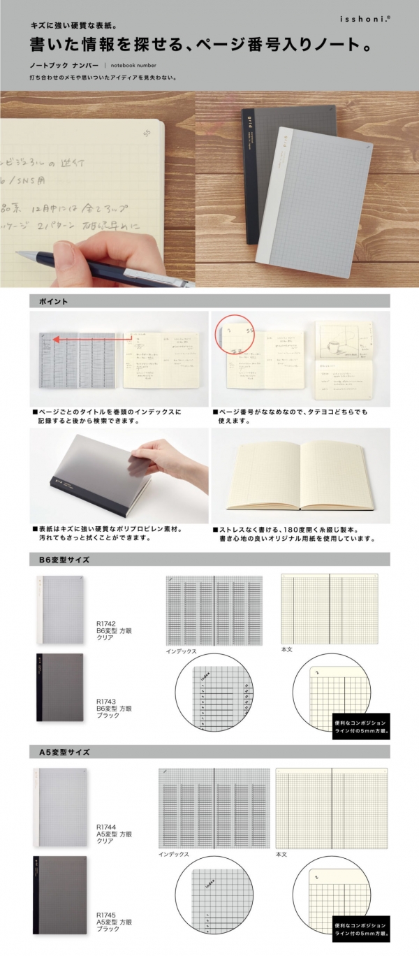 ・isshoni.ノート ナンバーA5方眼(クリア、ブラック 2色展開)価格:¥1,000(税込¥1,100)