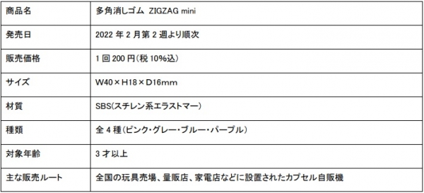 本商品は日本の折り紙をヒントに誕生した、カドがたくさんあり、カドで消したあとも新しいカドが出てくる立体形状の 消しゴム「多角消しゴム ZIGZAG」を全長約 40 ミリのミニサイズにしたカプセルトイ専用商品です。