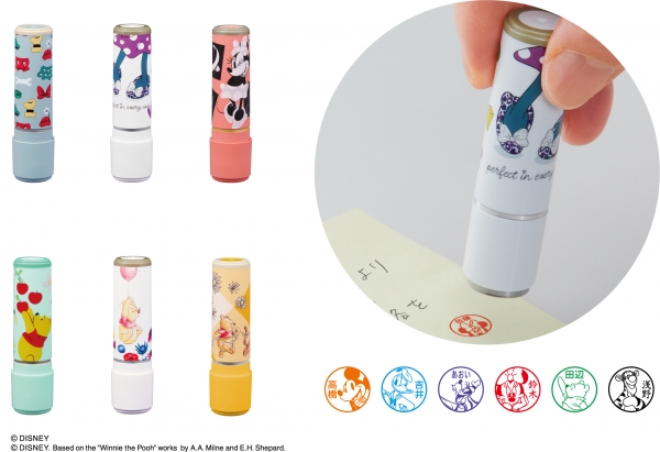 ディズニーキャラクター シリーズ「ネーム9メールオーダー式」は、ボディーにディズニーキャラクターアートをあしらったインキ内蔵式のネーム印です。ボディーのデザインは、ミッキー&フレンズ(1種)、ミニーマウス(2種)、くまのプーさん(3種)の全6種類をご用意しました。