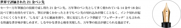その本体に世界で評価された、セーラー万年筆独自の大型21 金ペン先を搭載いたしました。受注生産により、用途やシーンに合わせてお好みの字幅を全7 種からお選びいただけます。
