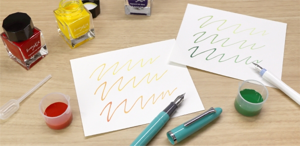 さらに、専用うすめ液を使えば「淡く、明るく」インクの混色の幅が広がります。自分だけのオリジナルカラーインクを作って、さらに万年筆を楽しめる全8色+専用うすめ液の発売です。