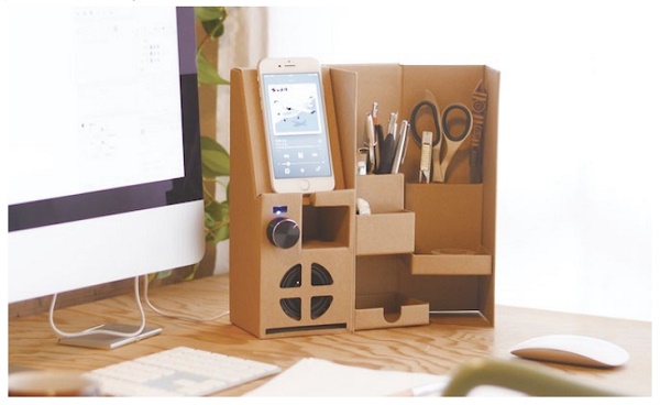 「ライフスタイルツールwith Speaker」は、デスク上や本棚などのレイアウトに馴染みやすいシンプルな形状をした卓上収納にスピーカー機能を搭載した紙箱型収納用品です。