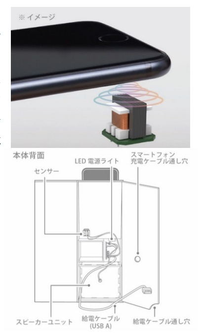 本体内部にスピーカーユニットを搭載しており、本体左側のスタンドに置いたスマートフォンから出る音の信号をスタンド背面のセンサー(※1)で拾うことで出力します。スマートフォンとのペアリング設定やケーブル接続は必要なく、スマートフォンを置くだけで再生中の音楽をスピーカー出力できます。スピーカーはUSB給電式(※2)で、ON/OFFの切り替えやボリュームの調整ができるダイヤル付きです。