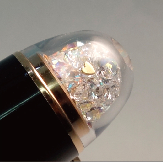 ペン先を製造する工程で発生するハート型の抜き片(以降 ハートピース)に思いを馳せ、そのハートピース 2 葉を天冠ドーム内にクリスタルと共におさめました。