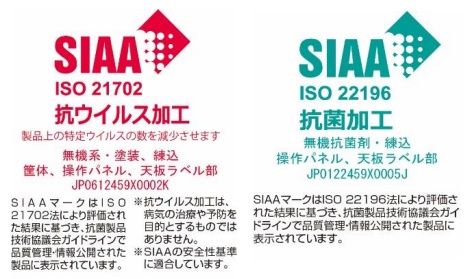 筐体の塗装には、抗ウイルス粉体塗料を使用し、人の手がよく触れる操作パネル部や天板ラベル部には、抗ウイルス・抗菌フィルム「リケガード(R)」を使用しています。筐体は「抗ウイルス加工」、操作パネル・天板ラベル部は「抗ウイルス加工・抗菌加工」のSIAA認証を取得しており、複数人が共同で使用するオフィスでも安心して使用できます。