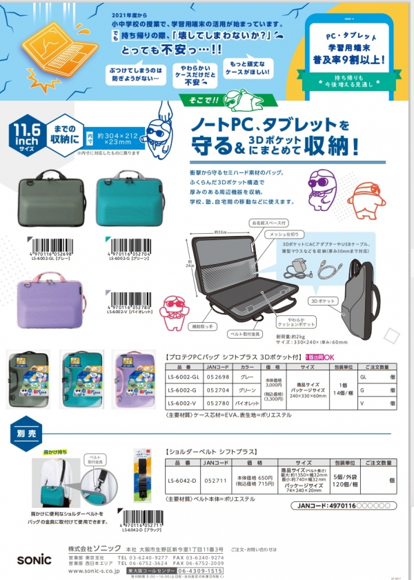 株式会社ソニックは、s h i f t + ( シ フトプ ラス )シ リ ーズからノートPC・タブレットをガチで保護11.6inchサイズまでの収納「プロテクPCバッグ シフトプラス 3Dポケット付」を発売。