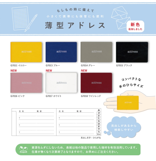 ・薄型アドレス(イエロー/ブルー/グレー/ブラック、新色:ピンク/ホワイト/ワインレッド 7色展開)