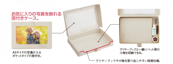 わが家の整理ケース<ペット用>は、ペット関連の書類やペット用品などをまとめて収納できるケースとクリヤーブックがセットになった製品です。ペットの写真(A5サイズ)を入れられるポケットタイプの透明窓付きのケースにクリヤーブック(A5・12ポケット)が1冊付属しています。