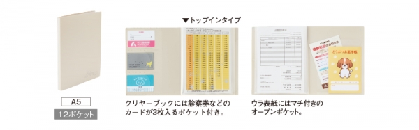 付属のA5クリヤーブックは、用途別・月別に使い分けられる12ポケットです。ペット保険で使用する病院の領収書やワクチン接種証明書等の書類の保管に適しています。