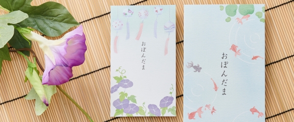 製品名:お盆玉 和風 ぽち/本体価格:110円/種類:全2種(アサガオ、金魚)/内容:3枚/製品寸法:70×120mm
