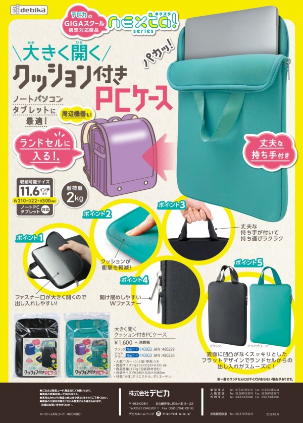 株式会社デビカは、GIGAスクール構想対応商品NEXTA(ネクスタ)シリーズから「大きく開くクッション付きPCケース」を発売。