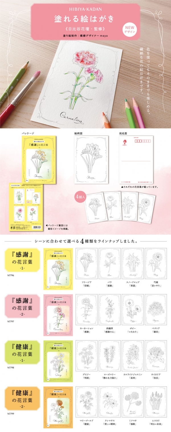 シーンに合わせて選べる4つのセット「感謝」の花言葉1・2、「健康」の花言葉1・2にはそれぞれ各4柄入っています。パッケージ裏面には着彩イメージを掲載しているので、どなたでも簡単に楽しむことができます。