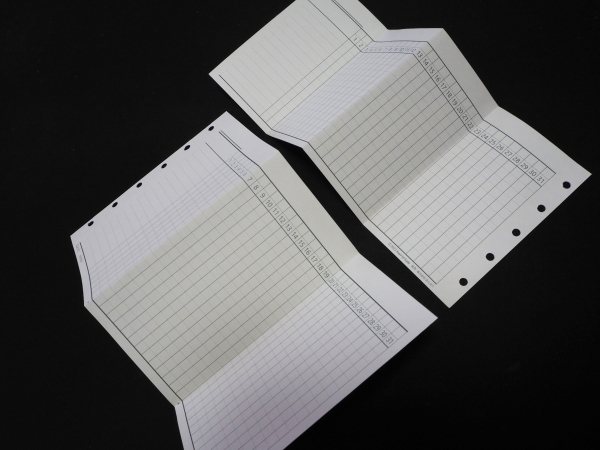 今回ご用意しているリフィルのサイズは、A5 スリム、バイブル、フィールド、ミニ6、マイクロ5の5 種類です。大きさによって、折り数が変わりますが、いずれも片面 1 か月分(両面印刷のため、1 枚で2 カ月分)を想定したフォーマットになっています。