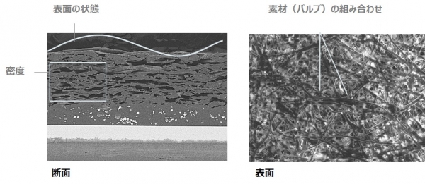 筆記した際の抵抗感と沈み込みの両方に影響します。素材とは、パルプの種類(太さ・形状)や、それに配合する薬剤のことで、薬剤によりインクの滲み具合や発色具合もコントロールすることができます。