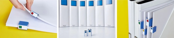 「キングファイルクリップ」は、オフィスのスタンダードファイルとして親しまれているキングジムのロングセラー製品キングファイルの形をしたミニクリップです。つまみ部分を引き出してから挟むスライドクリップ形状を採用しており、枚数の多い書類も力を入れずに綴じることができます。キングファイルでもおなじみの、背表紙についた4色のスクエアパターンで書類の分類も可能です。