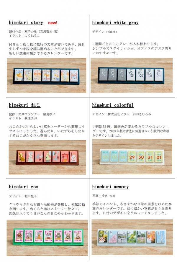 株式会社ケープランニングは、日めくり付せんカレンダー「himekuri」の 2023 年版(全 8 種)を 2022年 10 月 1 日(土)に発売します。「himekuri」は 2018 年に日本文具大賞 機能部門の優秀賞を受賞した、新しいタイプの日めくりカレンダーです。
