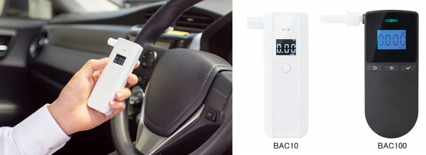 「アルコールチェッカー」は、息を吹き込むだけで酒気帯びの有無を数値とブザー、ライトで確認できるアルコールチェッカーです。コストパフォーマンスに優れた半導体式ガスセンサーを搭載したBAC10と、アルコール判別性能に優れた燃料電池式ガスセンサーを搭載したBAC100の2機種をラインアップしており、使用シーンに合わせて選べます。