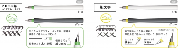 万年筆用ボトルインクを、より簡単手軽に利用できる万年筆ペン先のつけペンとして昨年の12月に発売した細字・1.0mm幅に続き、インクの楽しみ方を更に広げる新ペン先として、太い線幅の文字が書ける2.0mm幅と筆文字タイプを発売いたします。インクの消費が多い太い字幅のペン先のためにインクを保持するリザーバーパーツ付きで十分な筆記距離を確保しています。