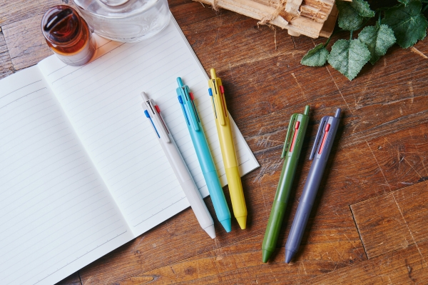 操作性を向上させた新3色ボールペンをより気軽にお使いいただけるよう、日常に溶け込むようなテイストのカラーリングに仕上げました。ナチュラルで飾らない色合いは、さまざまな服装やインテリアとマッチするため、飽きることなく長くお使いいただけます。