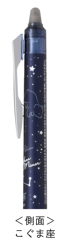 『フリクションポイントノック04 星物語』は、こぐま座やいるか座など、インキ色に合わせた8つの動物星座をペンの正面にデザインし、側面にはそれぞれの星座のモチーフとなる動物のイラストを描きました。インキ色にブラック、ブルーブラック、ブルー、レッドの4色をラインアップし、筆跡を消去するペン後部のラバーはインキ色に合わせた色を採用しました。独自開発の細書きに適した「シナジーチップ」のペン先により、スムーズな書き出しと細書きながらなめらかな書き心地を実現しました。