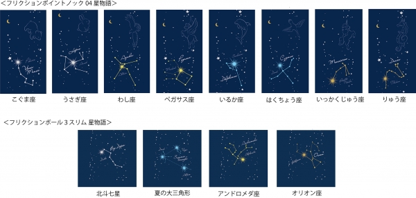 限定デザインとして展開するのは、動物星座をモチーフにした『フリクションポイントノック04 星物語』(価格:330円(税抜価格:300円))と、四季を代表する星座をモチーフにした3色ボールペン『フリクションボール3スリム 星物語』(価格:770円(税抜価格:700円))です。