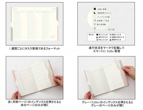 押さえる位置で開くページが変化する「マジックインデックス」(※)を採用し、「予定」と「ToDo」それぞれを簡単に検索することができます。赤のインデックスを押さえるとスケジュールページのみが、グレーのインデックスを押さえるとToDoページのみが開き、また、赤とグレーの間にある白のインデックスを押さえるとスケジュールとToDoページが交互に開く、必要なページのみをすぐに検索できる仕組みです。