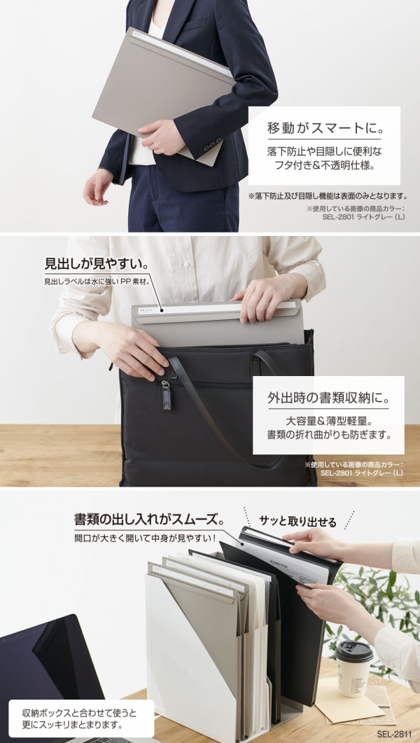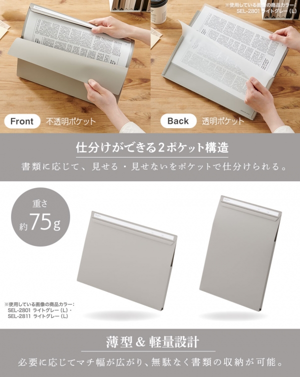 ●大容量&薄型で軽いので外出時の書類の持ち運びに便利。