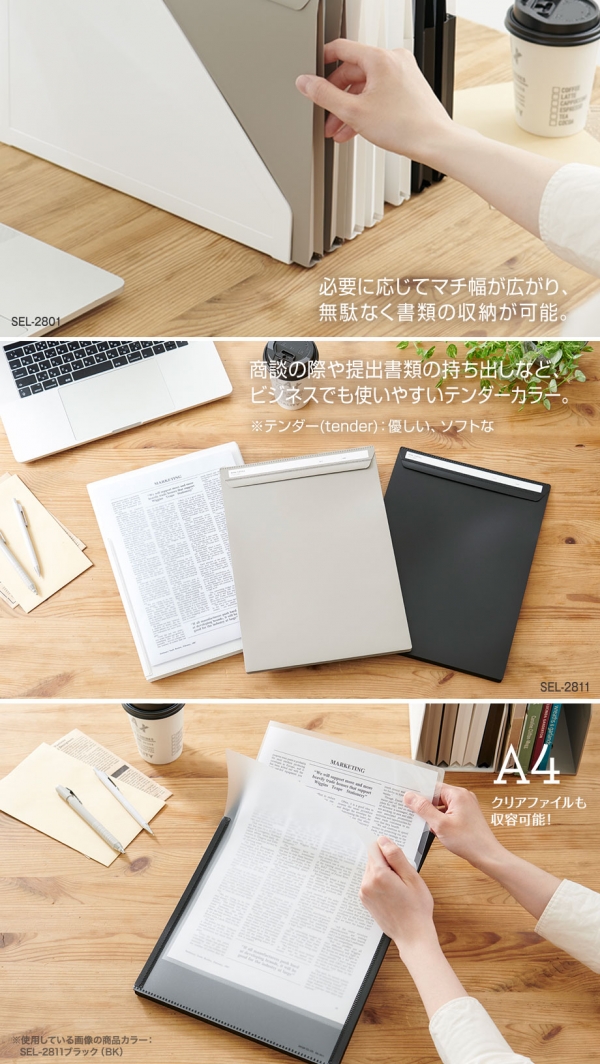 ●ビジネスでも使いやすいテンダーカラー、A4クリアファイルも収容可能。